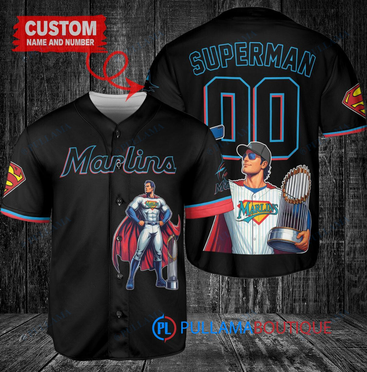 Miami Marlins x Superman DC Comics with Trophy Custom Baseball Jersey Black