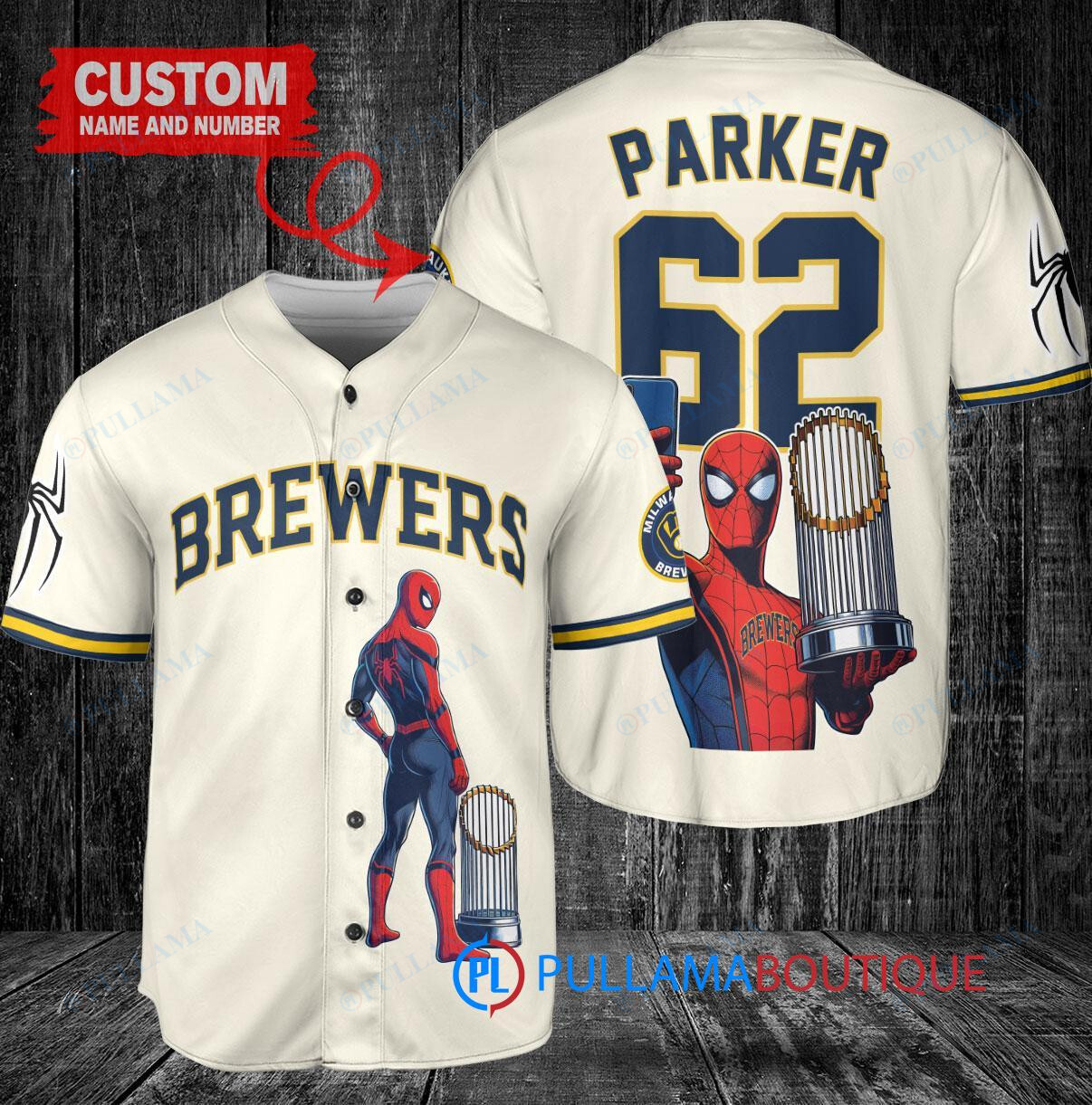 Milwaukee Brewers x Marvel Spiderman with Trophy Custom Baseball Jersey Cream