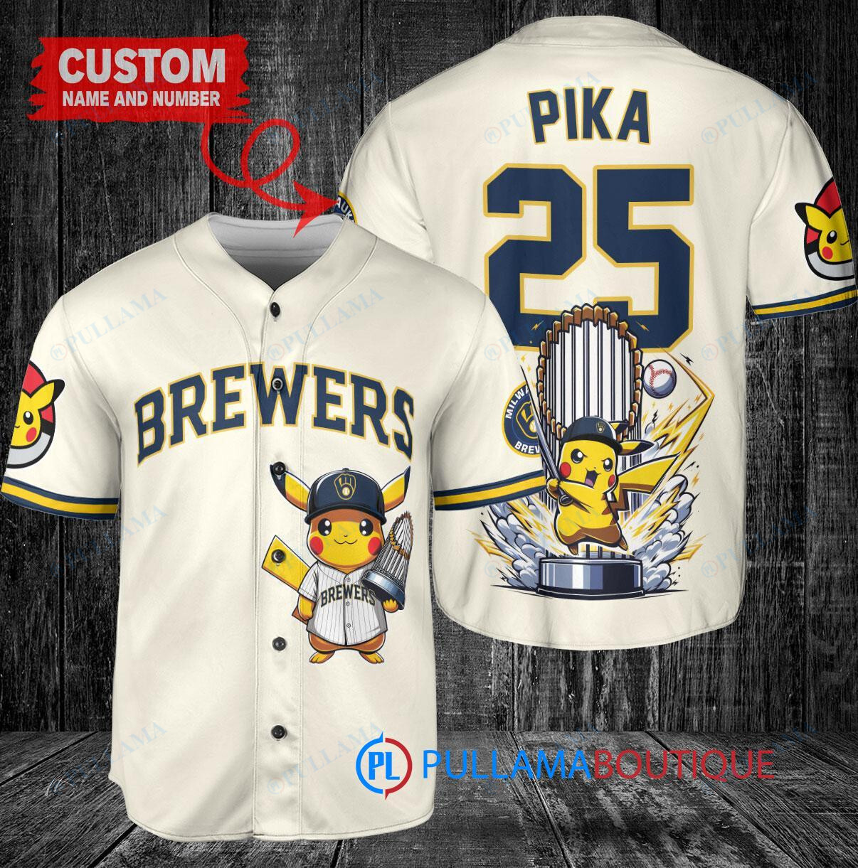 Milwaukee Brewers x Pikachu Pokemon with Trophy Custom Baseball Jersey Cream
