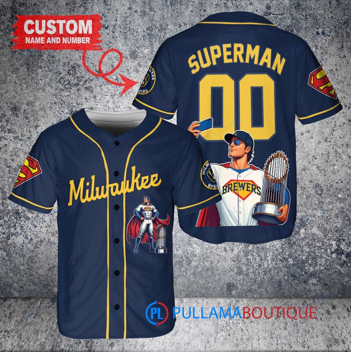 Show off your love for the Milwaukee Brewers and Superman with this custom baseball jersey featuring a unique DC Comics design. The navy jersey is adorned with the iconic Superman logo and comes with a trophy emblem, perfect for any die-hard fan. Made with high-quality materials, this jersey is a must-have for any collector or fan looking to stand out from the crowd.