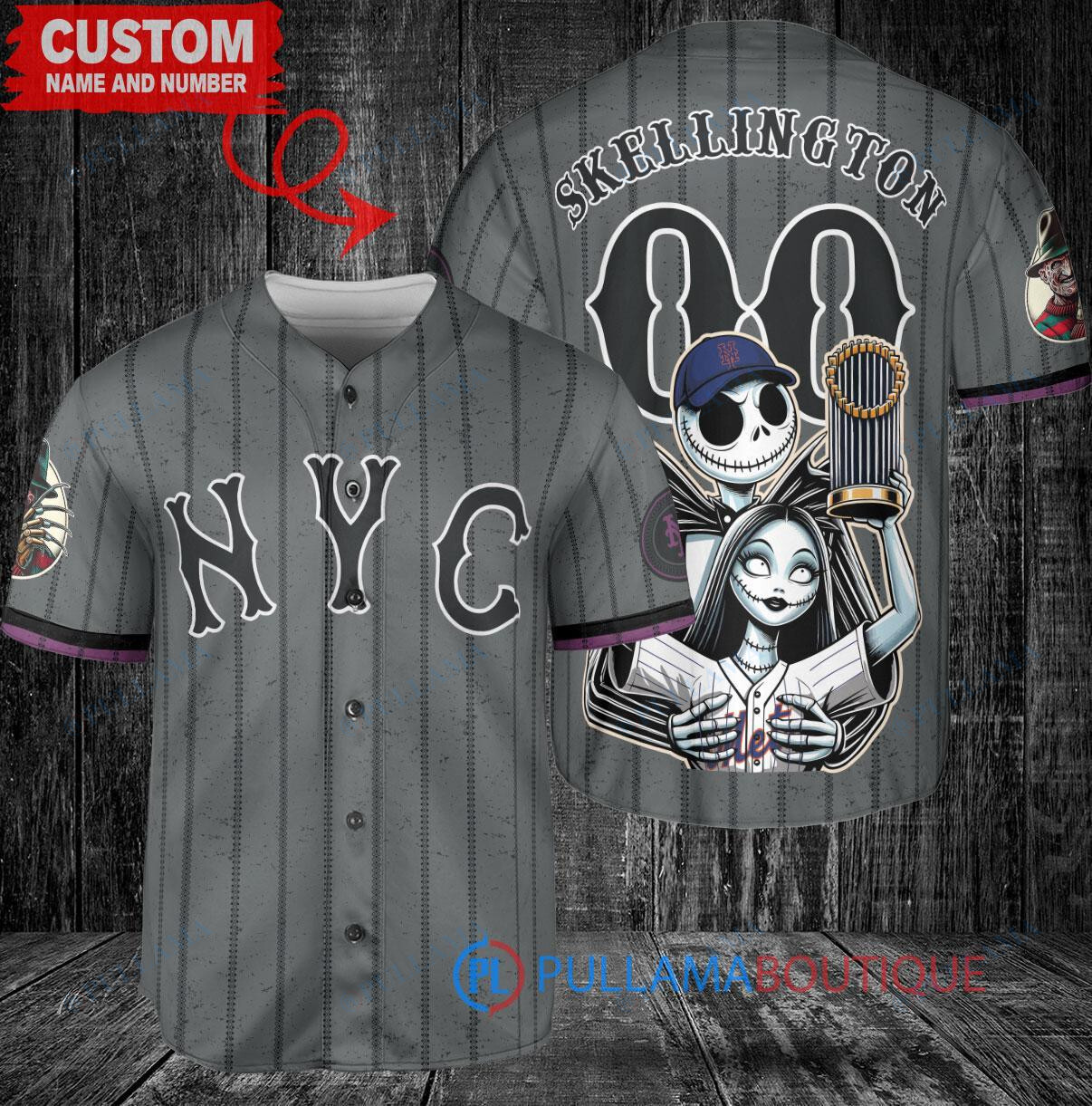 Show off your love for the New York Mets and The Nightmare Before Christmas with this custom baseball jersey featuring Jack Skellington and Sally. The jersey is designed in a Graphite City Connect style and includes a World Series Trophy graphic. Perfect for any Mets fan looking to add a unique and spooky twist to their game day attire.