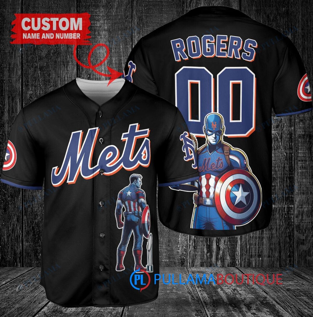 New York Mets x Marvel Captain America Steve Rogers with Trophy Custom Baseball Jersey Black