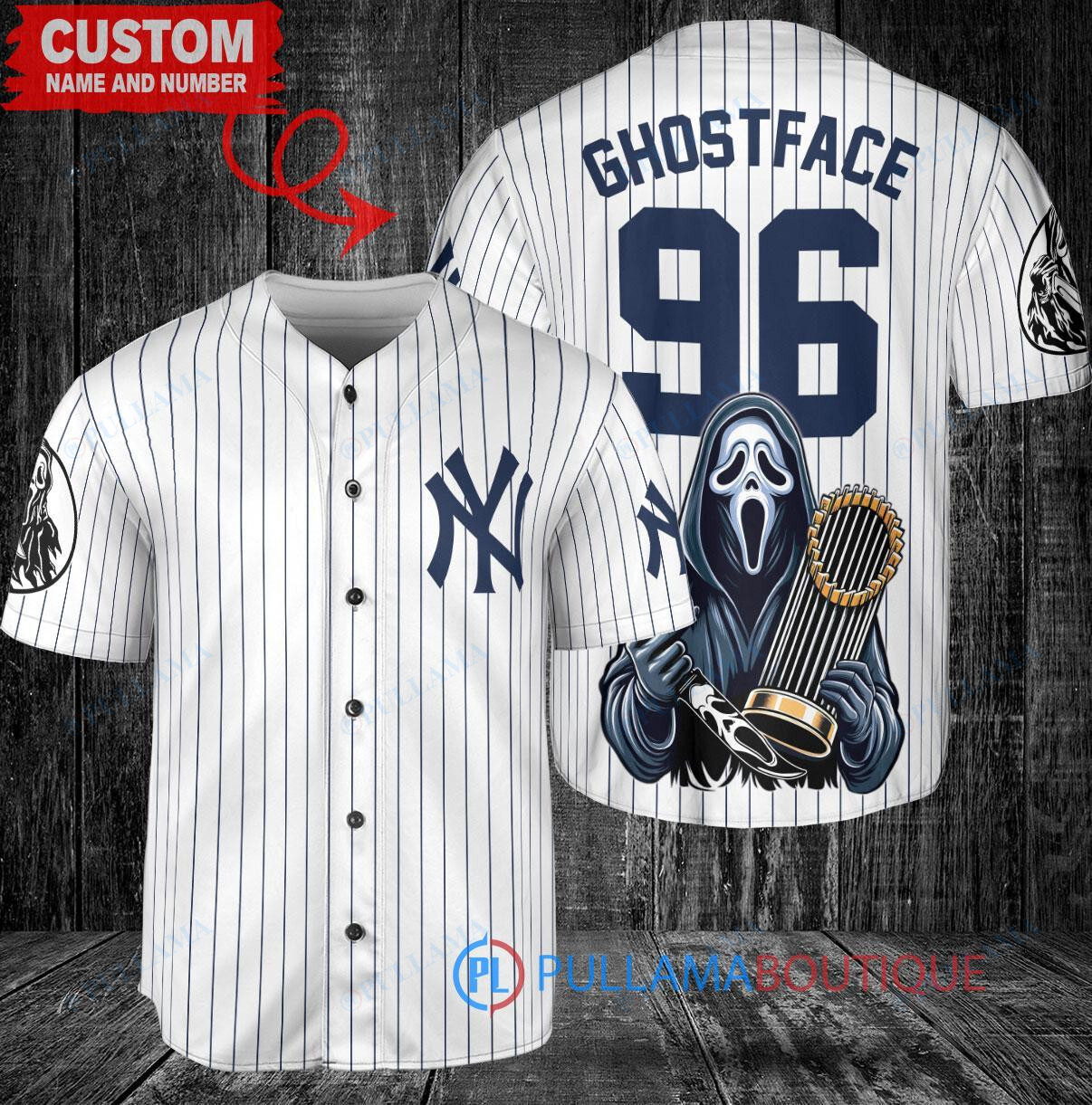 Get into the Halloween spirit with this custom New York Yankees x Ghostface Scream Halloween Baseball Jersey. Featuring a unique design with the World Series Trophy, this white jersey is perfect for any Yankees fan looking to show off their team pride during the spooky season. Made with high-quality materials, this jersey is sure to be a hit at any Halloween party or baseball game. Add a touch of fright to your game day outfit with this one-of-a-kind jersey!