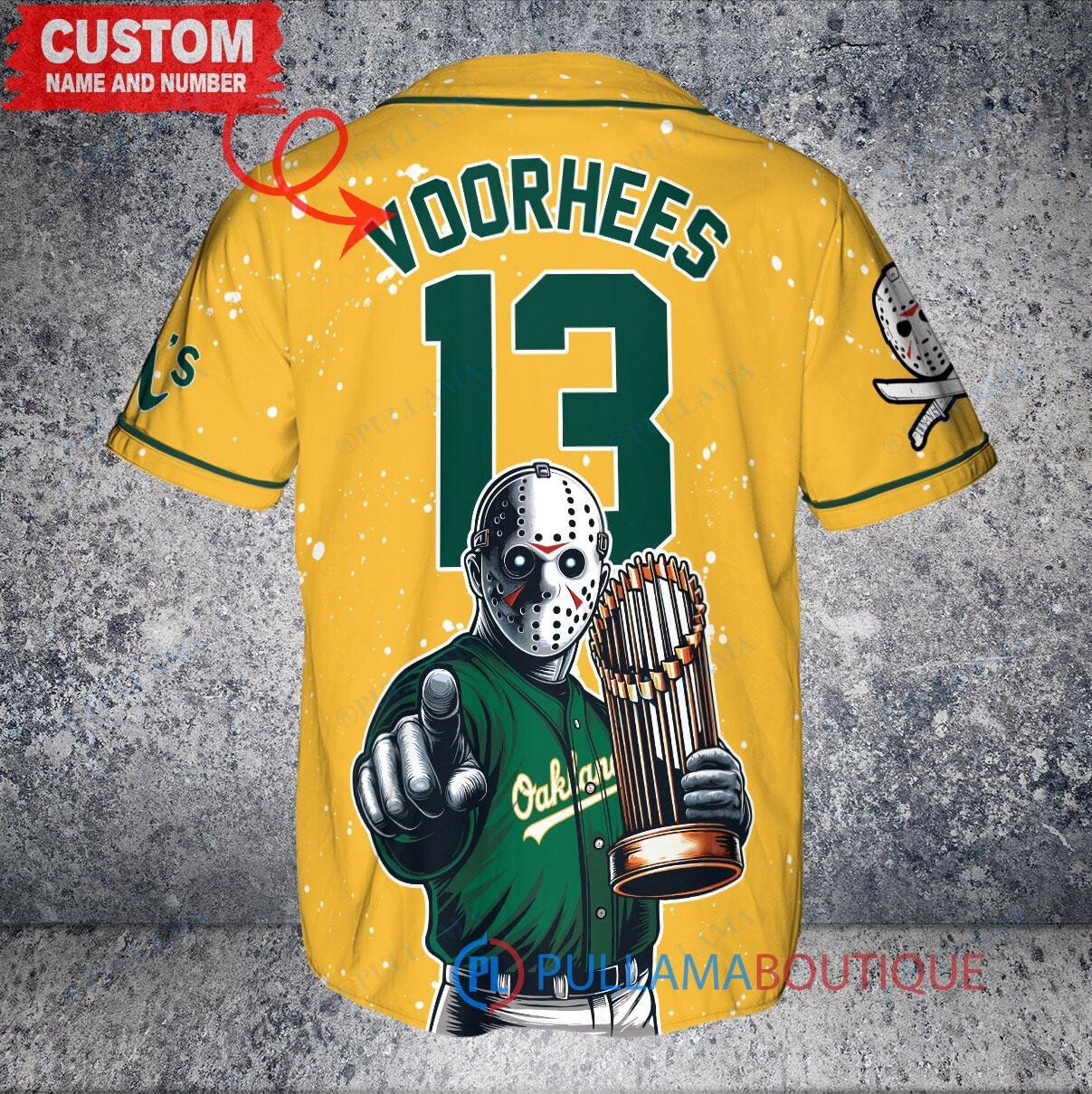 Get ready for Halloween with this unique Oakland A’s Jason Voorhees World Series Trophy Baseball Jersey in gold. Perfect for any baseball fan looking to add a spooky twist to their collection. Made with high-quality materials, this jersey is sure to stand out in any crowd. Add a touch of horror to your game day outfit with this one-of-a-kind jersey.