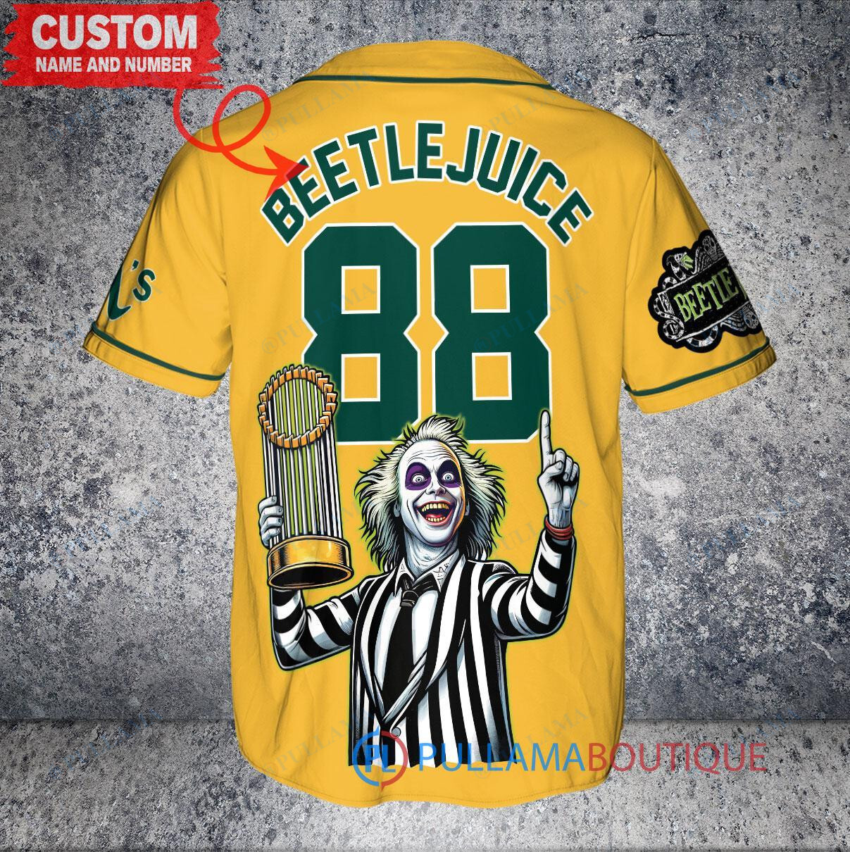 Celebrate Halloween in style with this Oakland Athletics Beetlejuice World Series Trophy Baseball Jersey in Gold. This unique jersey features a spooky Beetlejuice design, perfect for the Halloween season. Show off your team spirit and stand out from the crowd with this eye-catching jersey. Perfect for any Oakland Athletics fan looking to add a fun and festive twist to their game day attire.