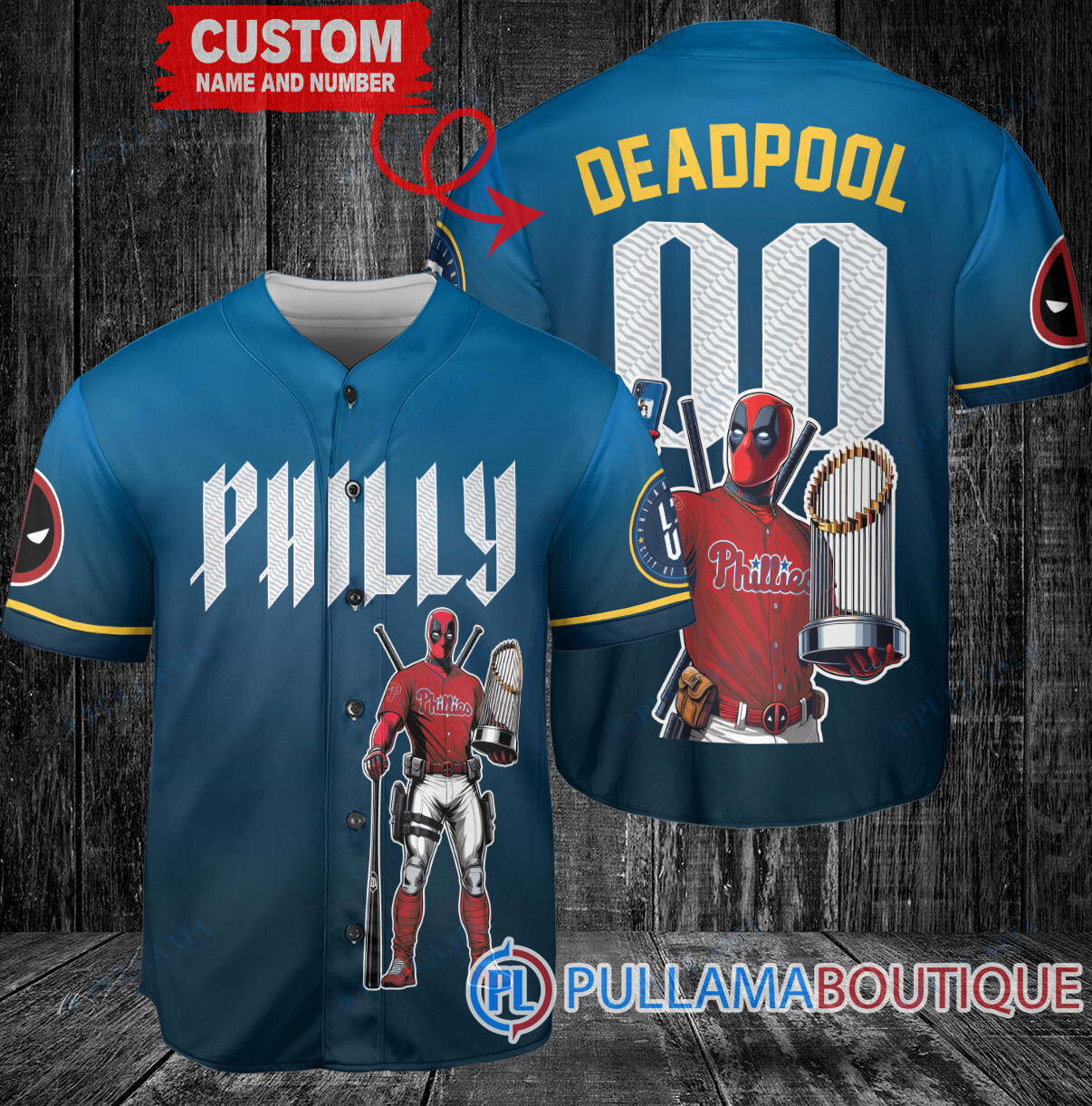 Show off your love for the Philadelphia Phillies and Deadpool with this custom baseball jersey in blue City Connect design. Featuring a unique trophy design, this jersey is perfect for any fan looking to stand out in the crowd. Made with high-quality materials, this jersey is comfortable to wear while cheering on your favorite team. Get yours today and show your support in style!