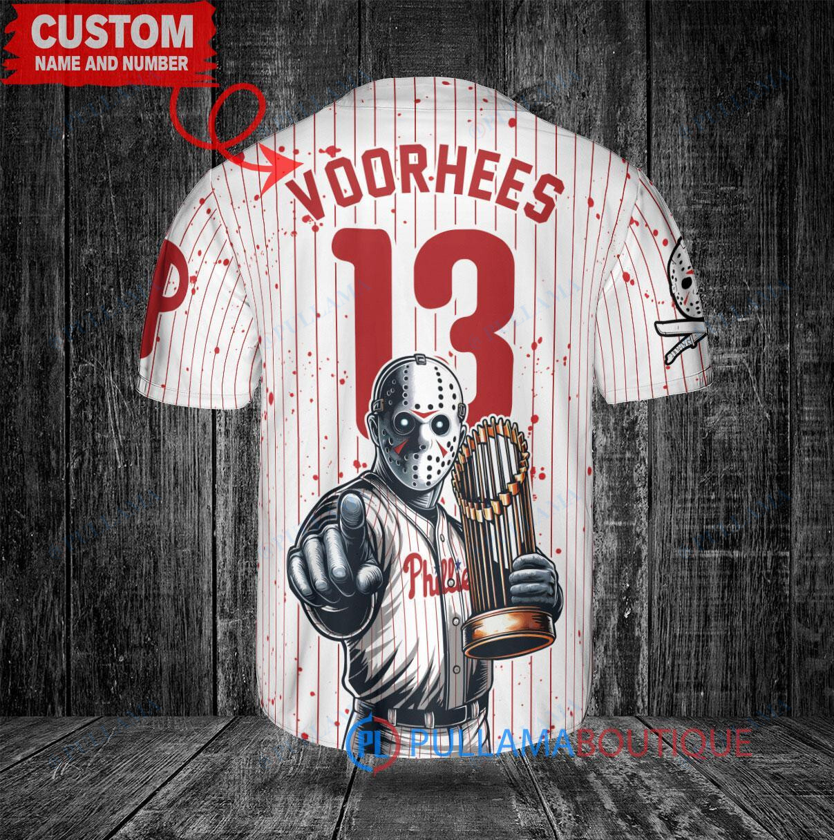 Get ready for Halloween with this custom Philadelphia Phillies x Friday the 13th Jason Voorhees Baseball Jersey! This unique white jersey features a spooky design of Jason Voorhees holding the World Series Trophy, perfect for any baseball and horror fan. Stand out from the crowd and show off your love for the Phillies with this one-of-a-kind jersey. Perfect for Halloween parties, baseball games, or just adding a fun twist to your wardrobe. Get yours today and celebrate the spooky season in style!