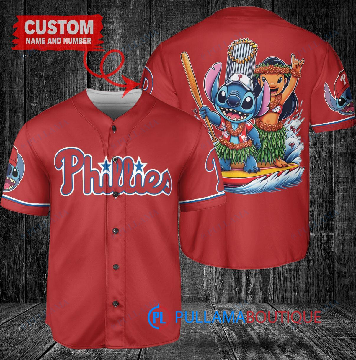 Show your support for the Philadelphia Phillies with this unique Lilo & Stitch baseball jersey in red. This jersey features a trophy design, perfect for any fan looking to stand out in the crowd. Made with high-quality materials, this jersey is comfortable to wear while cheering on your favorite team. Perfect for game days or casual wear, this jersey is a must-have for any Phillies fan.
