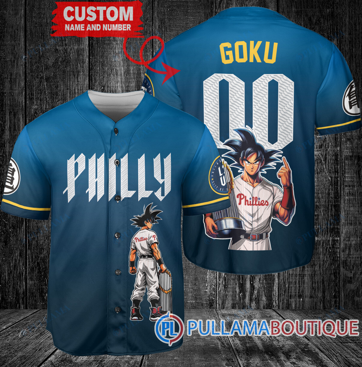 Philadelphia Phillies x Son Goku Kakarot Super Saiyan Dragon Ball Z with Trophy Baseball Jersey Blue City Connect V2
