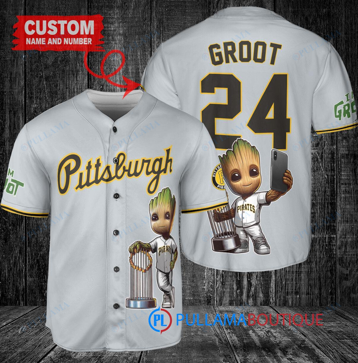 Show off your love for the Pittsburgh Pirates and Marvel’s Guardians of the Galaxy with this custom baseball jersey featuring Baby Groot holding a trophy. The gray jersey is perfect for any fan looking to stand out in the crowd. Made with high-quality materials, this jersey is both stylish and comfortable, making it a great addition to any fan’s collection. Get ready to cheer on your favorite team in style with this unique and eye-catching jersey.