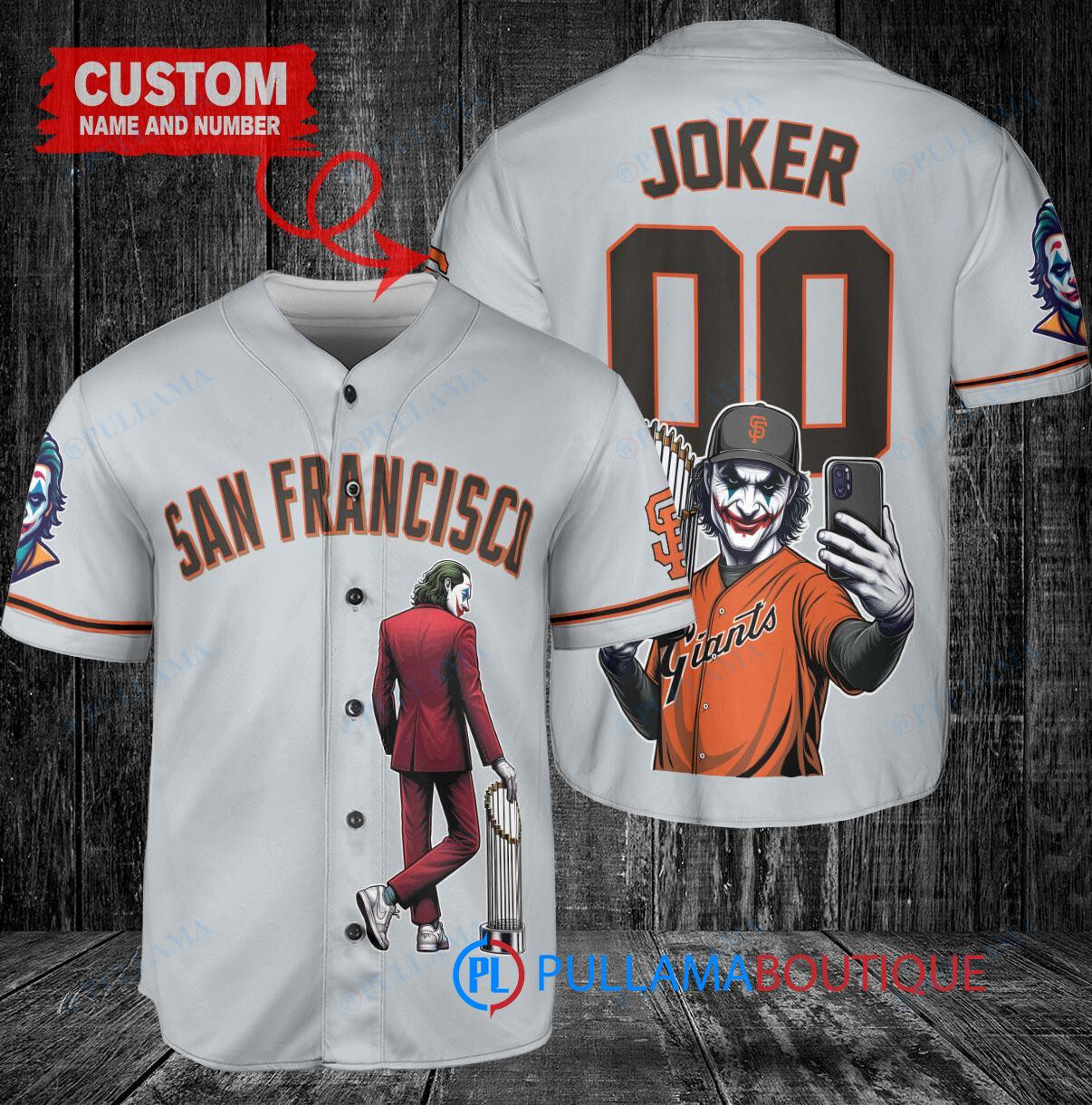 Show off your love for the San Francisco Giants and the Joker from DC Comics with this custom baseball jersey in gray. Featuring a unique design with the Joker holding a trophy, this jersey is perfect for any fan looking to stand out in the crowd. Made with high-quality materials, this jersey is comfortable to wear while showing off your favorite team and character. Perfect for game days or casual wear, this jersey is a must-have for any die-hard fan.