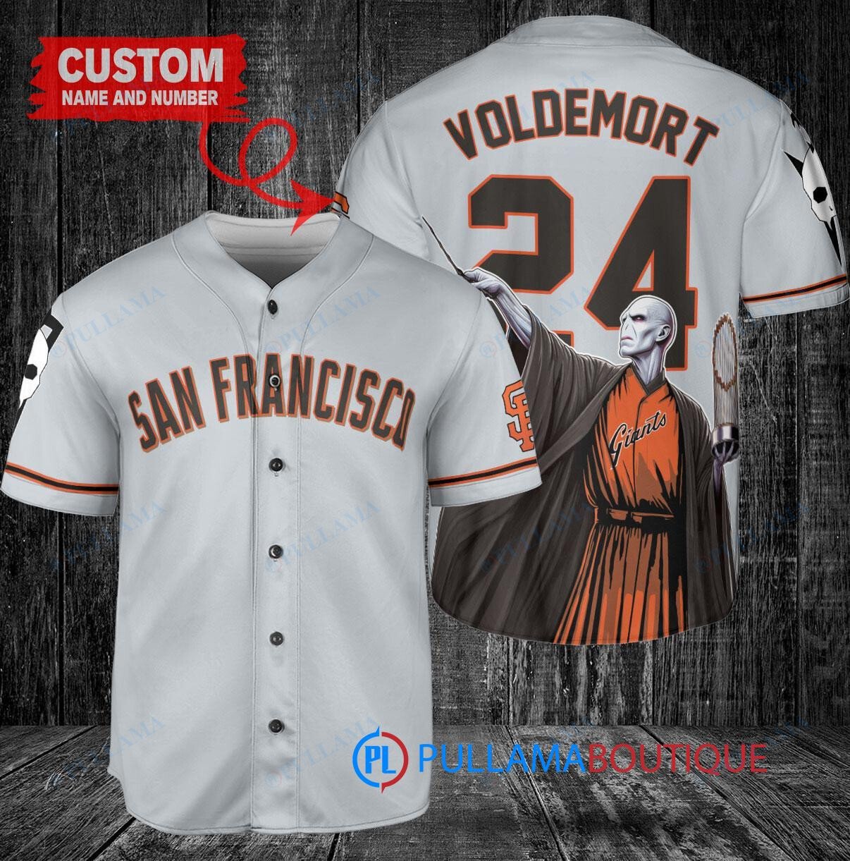 Show off your love for both the San Francisco Giants and Harry Potter with this custom baseball jersey featuring Lord Voldemort. This gray jersey is perfect for any fan looking to stand out in the crowd. The jersey also includes a trophy design, adding a unique touch to your game day outfit. Get ready to cast a spell on the competition with this one-of-a-kind jersey!