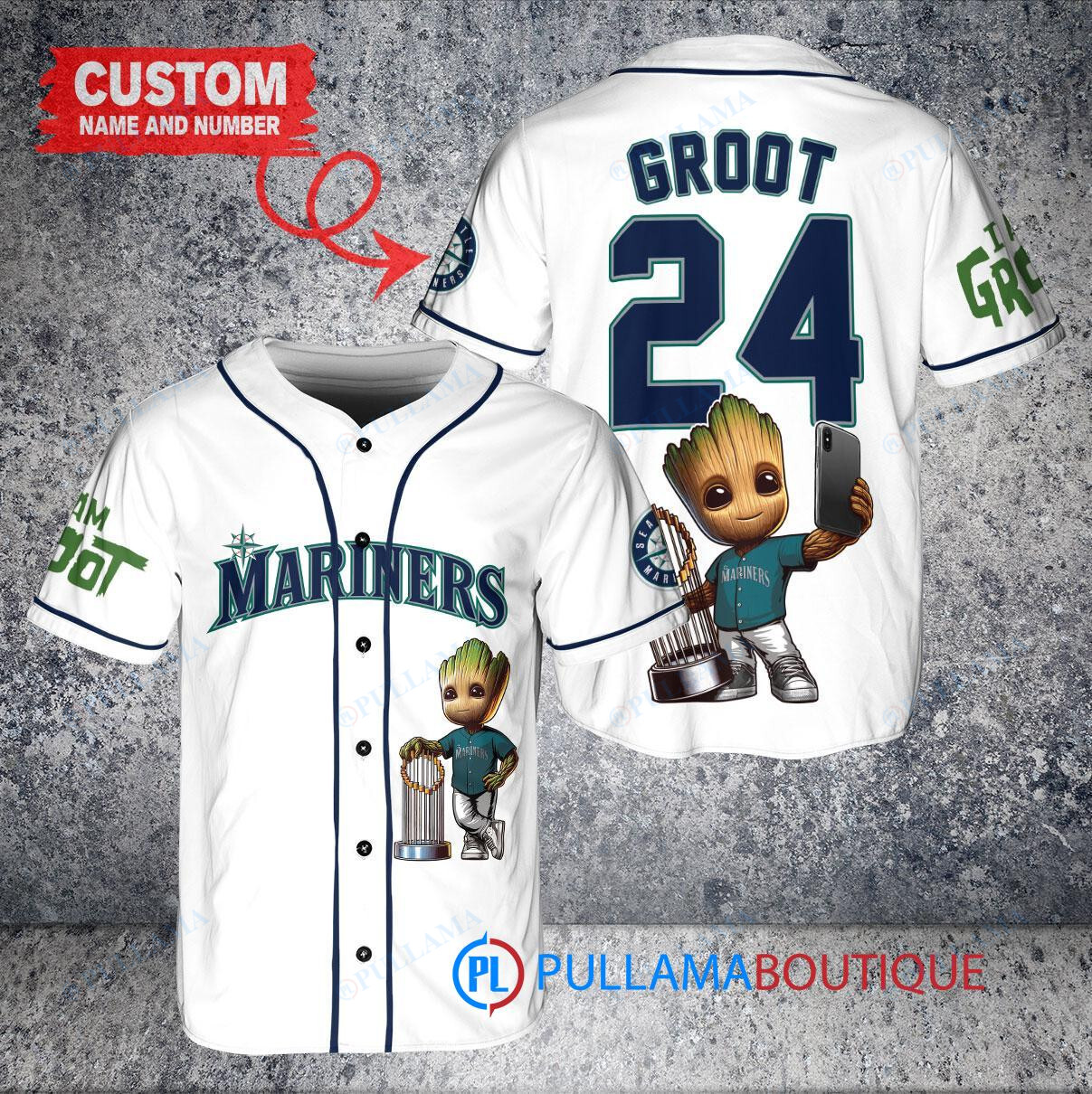 Show off your love for the Seattle Mariners and Marvel’s Guardians of the Galaxy with this custom baseball jersey featuring Baby Groot holding a trophy. This white jersey is perfect for any fan looking to stand out in the crowd. Made with high-quality materials, this jersey is both stylish and comfortable, making it a great addition to any fan’s collection. Get yours today and show your support for your favorite team and superhero!