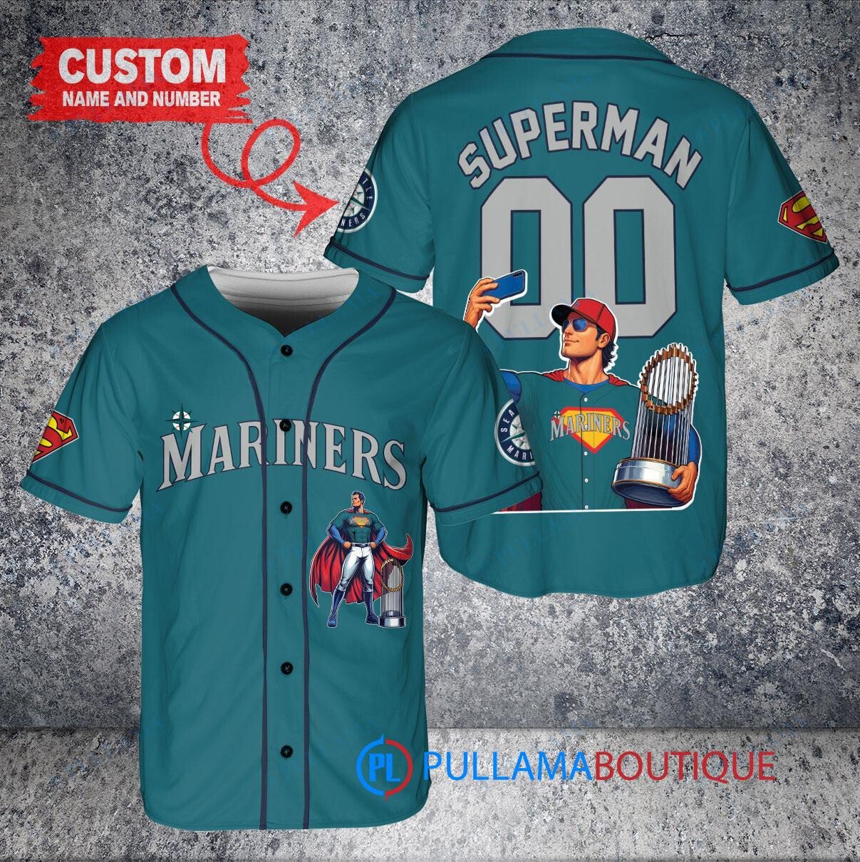 Show off your love for the Seattle Mariners and Superman with this custom baseball jersey featuring a unique Aqua design. Made in collaboration with DC Comics, this jersey is perfect for any fan looking to stand out in the crowd. The jersey also features a trophy design, adding an extra touch of style. Get ready to hit a home run with this one-of-a-kind jersey!