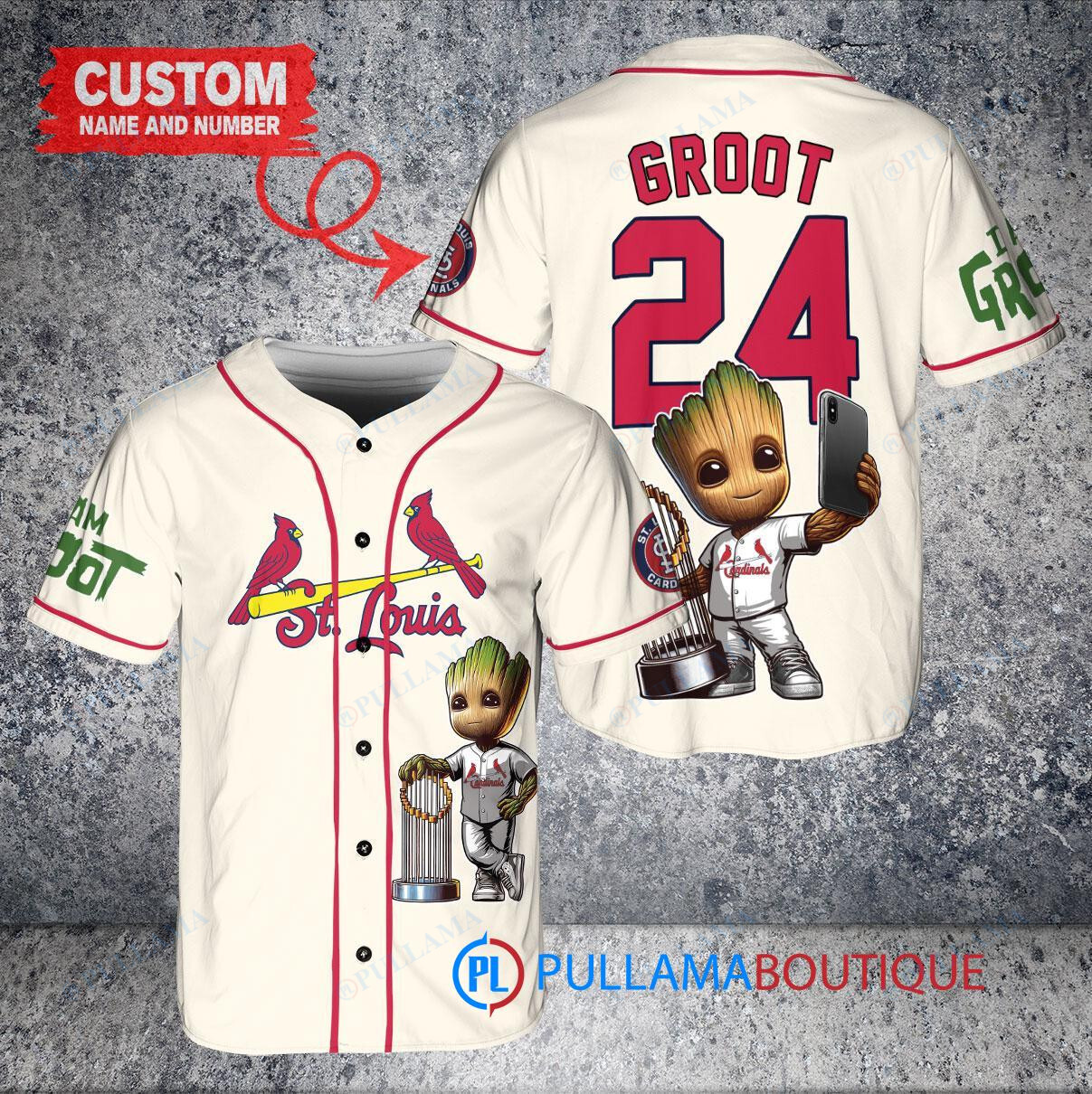 St. Louis Cardinals x Baby Groot Marvel Guardians Of The Galaxy with Trophy Custom Baseball Jersey Cream