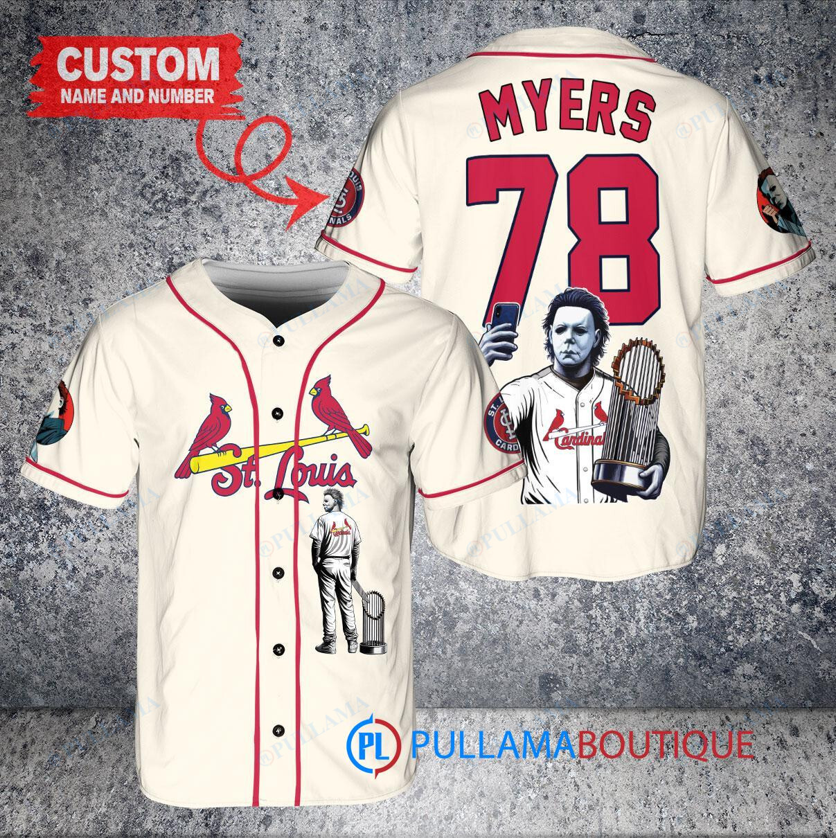 Get ready for Halloween with this custom St. Louis Cardinals baseball jersey featuring Michael Myers holding a trophy. The cream color adds a unique touch to your Halloween outfit. Perfect for any Cardinals fan looking to show off their team spirit in a spooky way. Made with high-quality materials for a comfortable fit. Add this jersey to your collection today!