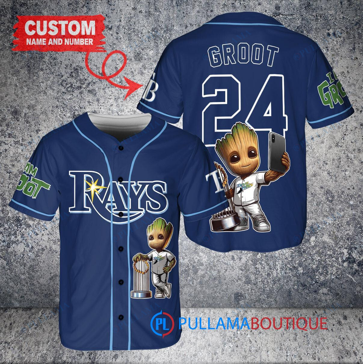 Tampa Bay Rays x Baby Groot Marvel Guardians Of The Galaxy with Trophy Custom Baseball Jersey Navy