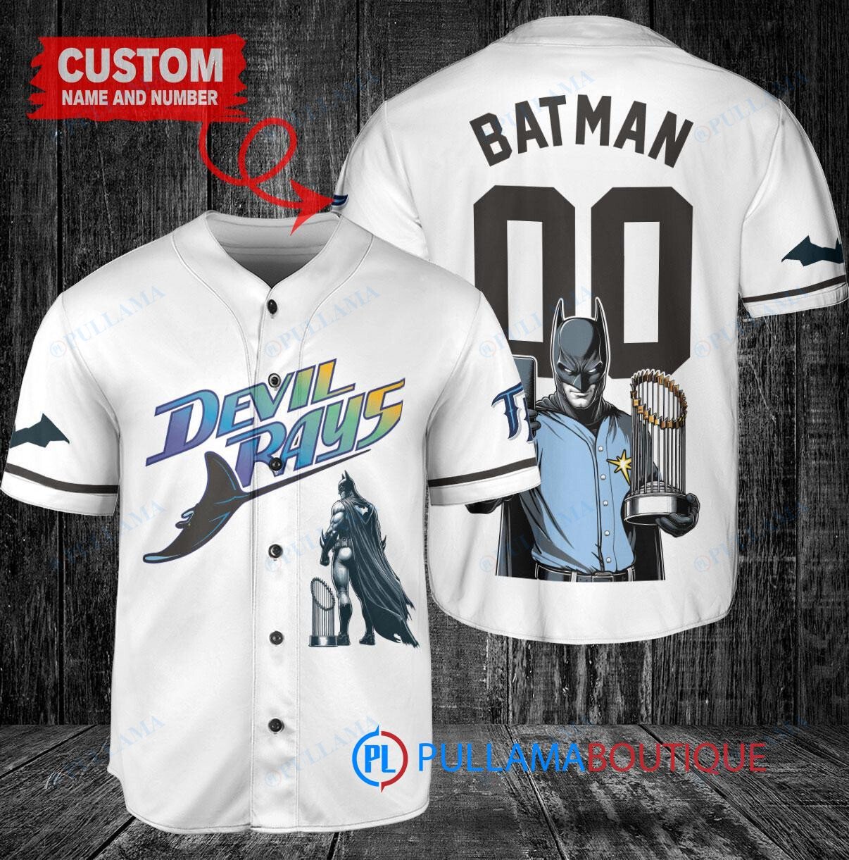 Tampa Bay Rays x DC Comics Batman The Dark Knight with Trophy Custom Baseball Jersey White Home Replica