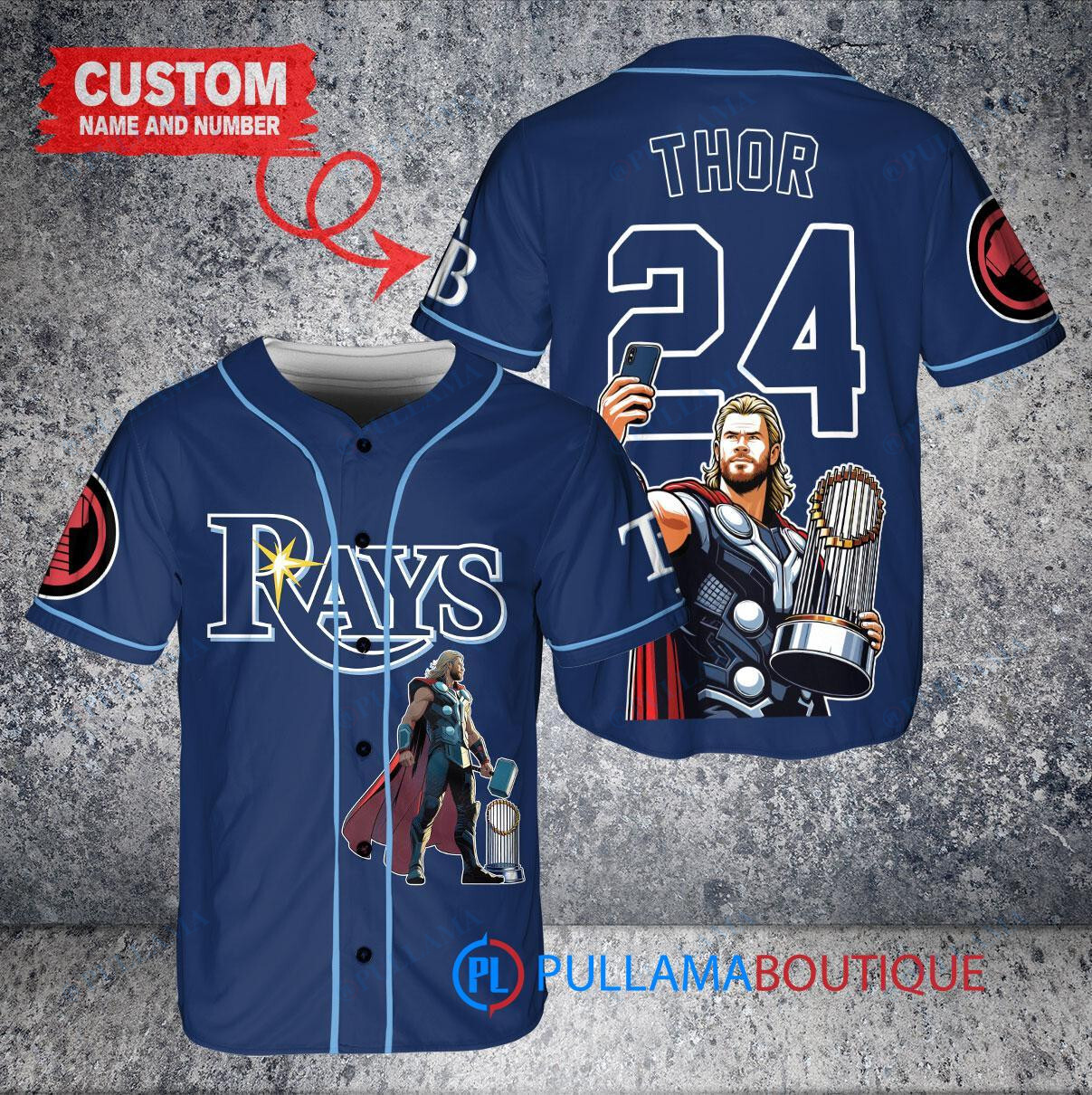 Show off your love for the Tampa Bay Rays and Marvel with this custom baseball jersey featuring Thor. The navy jersey is designed with a unique trophy graphic, perfect for any fan looking to stand out in the crowd. Made with high-quality materials, this jersey is a must-have for any baseball enthusiast. Get yours today and hit a home run with your style!