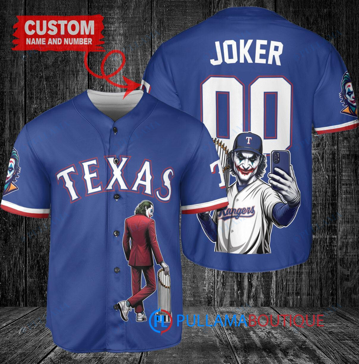 Show off your love for the Texas Rangers and the Joker from DC Comics with this custom baseball jersey. The royal blue jersey features a unique design with the Joker holding a trophy, perfect for any fan looking to stand out in the crowd. Made with high-quality materials, this jersey is both stylish and comfortable, making it a great addition to any fan’s collection. Whether you’re at the game or just hanging out with friends, this jersey is sure to turn heads. Get yours today and show your support for your favorite team and comic book character!